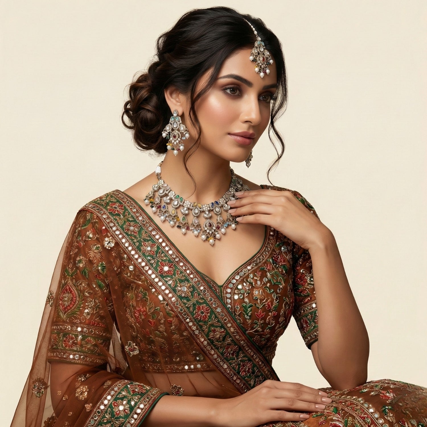 A majestic heritage-inspired jewellery set in antique gold finish, crafted with intricate Kundan and Polki-style detailing. Adorned with vibrant multi-colored stones, elegant teardrop motifs, and graceful pearl drops, it exudes a rich royal charm. Paired with statement earrings and a matching maang tikka, this set reflects timeless tradition with festive elegance.