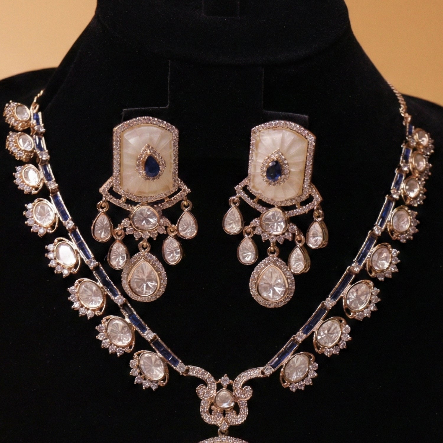 This is a luxurious and elegant set featuring a finely crafted necklace with matching statement earrings. The design showcases shimmering stones with a sophisticated square pendant style and delicate hanging drop elements. Its graceful detailing gives a rich and timeless appeal.